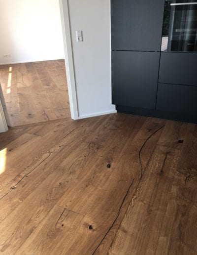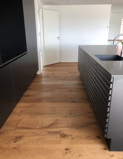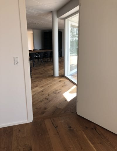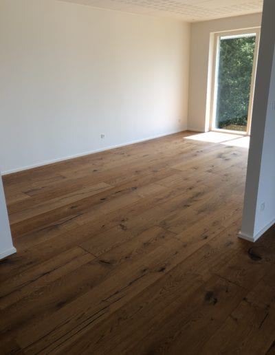 Olie: Gulvplankerne olieres 3 gange med lufthærdende olie fra WOCA. De første 2 gange er med klar eller pigmenteret olie. Den sidste behandling er altid med klar olie/voks, som giver gulvet en stærk og vandafvisende overflade.